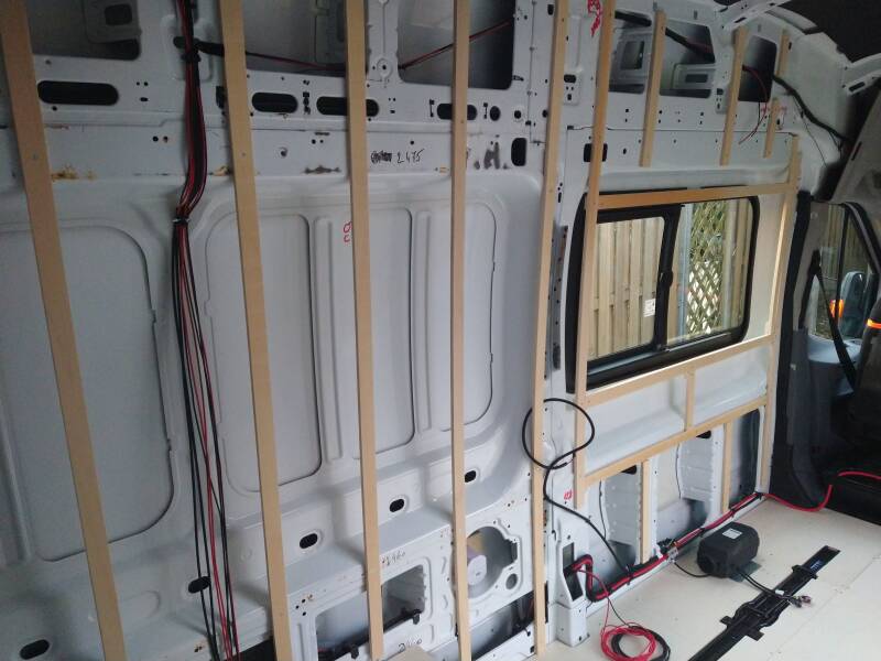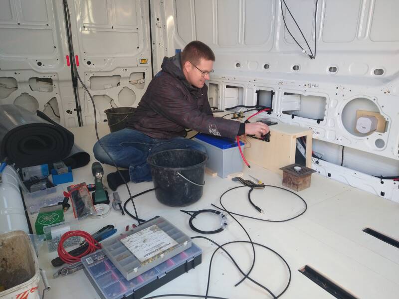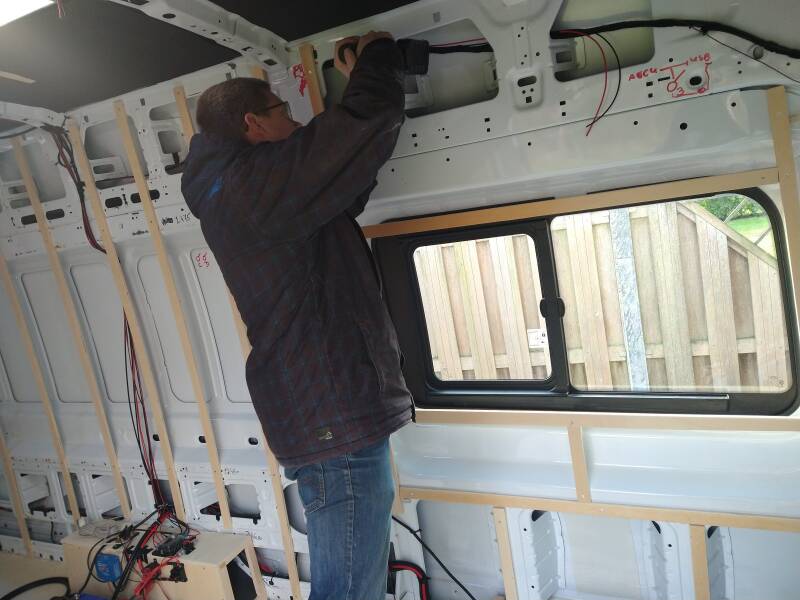 Ronald heeft dus de volledige elektrische installatie aangelegd. En alles werkt! Dus de huishoudaccu wordt nu opgeladen door de zonnepanelen als het zonnetje schijnt. Geen zon op vakantie? Dan kan de huishoudaccu altijd via de walstroom opgeladen worden. En ook tijdens het rijden laadt de huishoudaccu op als de startaccu's weer vol zijn. In de camper liggen alle kabels nu gereed om apparatuur op aan te sluiten. Te weten lampjes, usb-laadpunt, koelkast en standkachel. Als we een normale stekker willen gebruiken (laptop o.i.d.) dan moeten we op de camping aan de stroom aansluiten. Dan kunnen we gewoon 230 V gebruiken. Aangezien wij tevreden zijn met het opladen van een ereader/telefoon, zijn de usb-punten voor ons ruimschoots voldoende. Maar we maken wel een dubbel stopcontact, voor net als het toch nodig is.