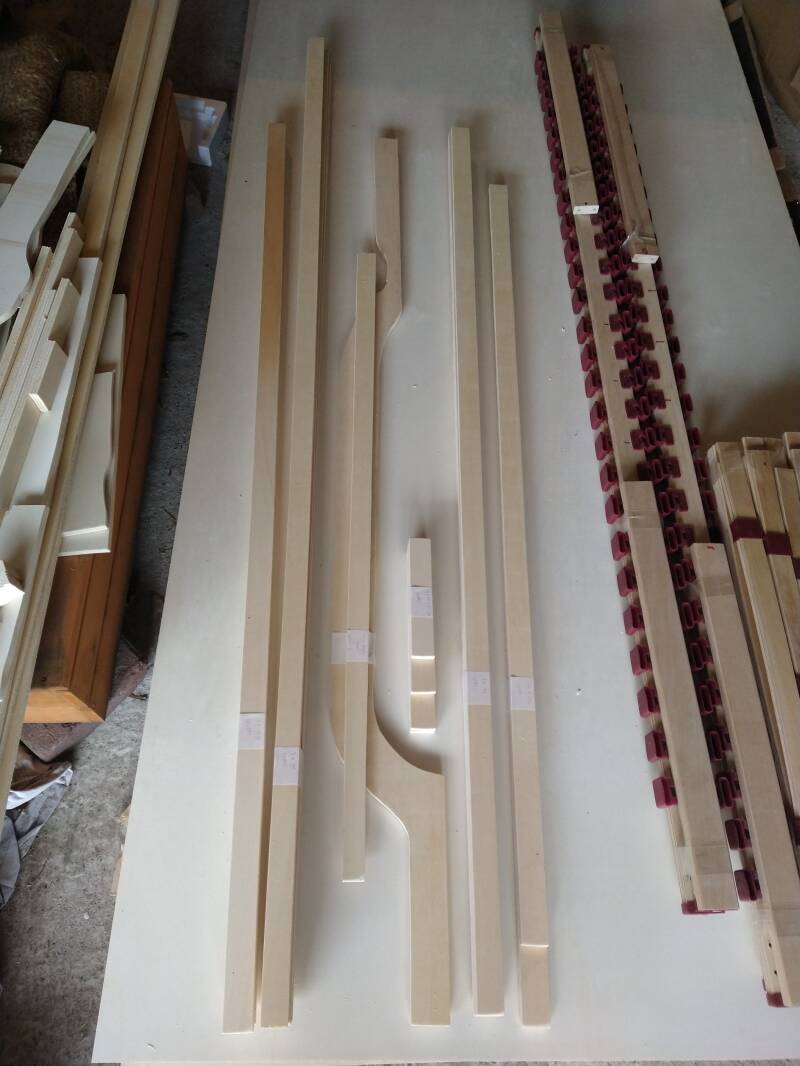 Om de wandpanelen te kunnen plaatsen en kastjes aan de muur te kunnen bevestigen zijn daar stevige rachels nodig. Deze hebben we gezaagd uit 12 mm dik populieren multiplex. Met de invalzaag gaat dat heel gemakkelijk en netjes recht. De juiste lengtes verzorgde ik op een moment dat ze nog niet meteen geplaatst konden worden. Dus alles netjes markeren en tijdelijk wegleggen, zodat Ronald ze op een later moment kon plaatsen op de juiste plekken. Ronald heeft alle rachels netjes met blindklinkmoeren en verzonken boutjes geplaatst. Supersterk, relatief makkelijk werken en een strak resultaat. Enkele rachels vroegen om een speciale vorm, deze maakte ik op maat met de decoupeerzaag (die ook overuren draait hier).