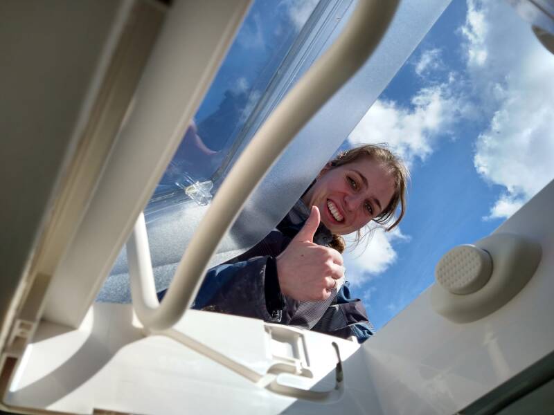 Helaas hadden we een kleine lekkage rondom één dakraam. Toen ik op het dak zat, zag ik dat er een minuscuul gaatje zat in de kit. Gelukkig was het een heerlijk weertje vandaag om het meteen weer op te lossen! Dus hop het dak op en kitten maar...