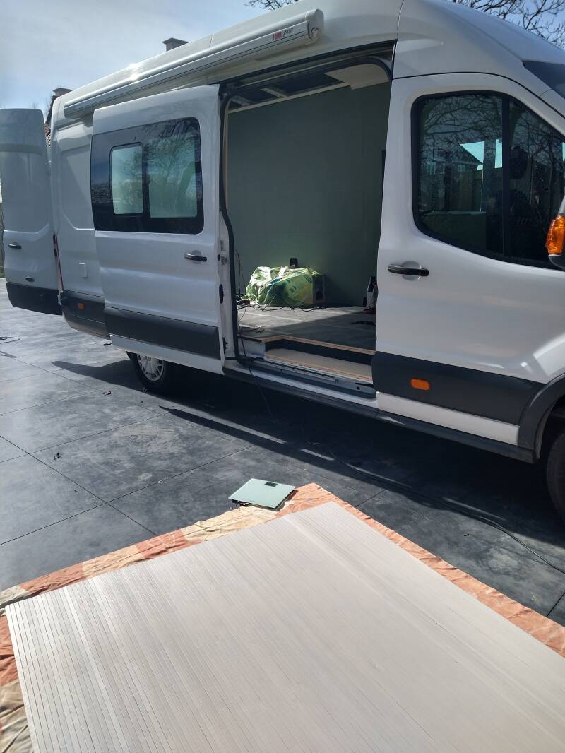 Op de eerste foto zie je het plafond op de grond buiten de bus liggen. Daar maakten we het op maat. Vervolgens eerst op de weegschaal en dan pas in de bus. Voor de onderdelen waarvan we het gewicht alleen nog maar ingeschat hadden (zoals plafond en vloer), wilden we toch echt even weten hoeveel kilo er weer bij kwam. Want 3500 kg is veel, maar met alle bouwmaterialen vul je het zo op...
