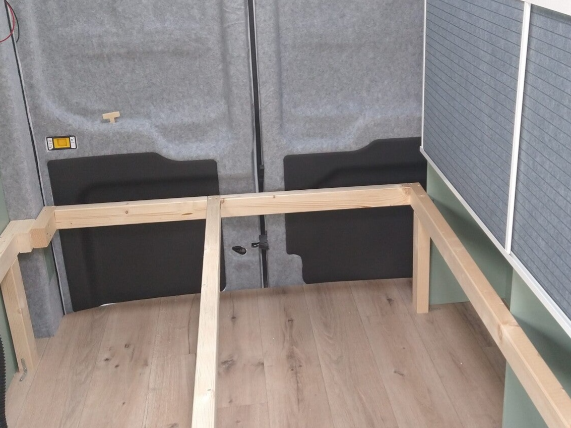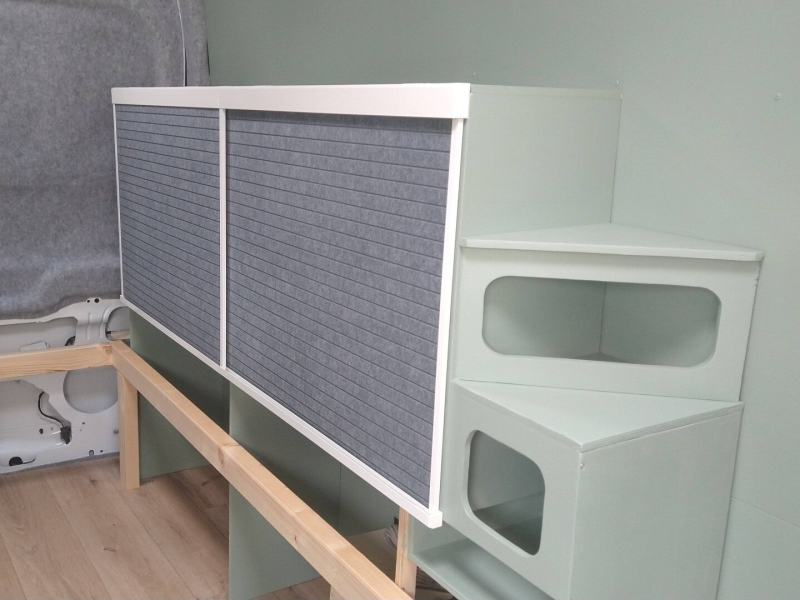 Ook maakten we de deuren voor de kledingkast, oprecht een leuke puzzel van Ikea dit systeem. Het niveau ligt net een tikje hoger dan een billy boekenkast ;) Het is een railsysteem met vilten schuifdeuren, dus heerlijk lichtgewicht. En ze hebben stiekem ook sluitingen erin gemaakt vanuit Ikea, dus tijdens het rijden blijven ze (als het goed is) mooi dicht zitten! Toch beetje jammer als de sokken door de camper zouden gaan bij het rijden van bochtige bergweggetjes bijvoorbeeld.