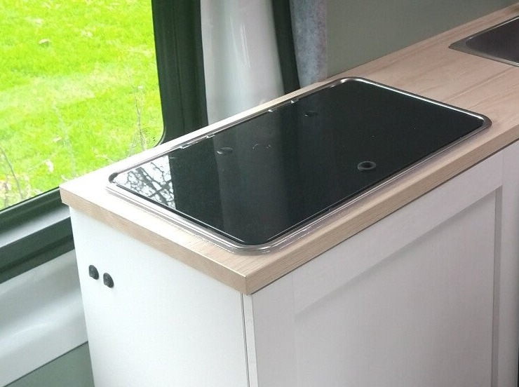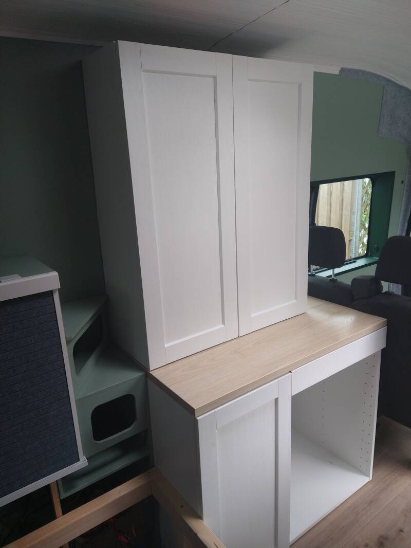De keuken bestaat uit twee delen: één deel aan de kant van de zijdeur met een wasbak/kraan en gaskookplaat en het andere deel is met name opbergruimte en onderin komt nog de koelkast. We kozen voor een Ikea keuken. Dit kost ons ongeveer 50 kg extra. Bij Ikea staat namelijk per pakket vermeld wat het weegt. Van populieren multiplex is het soortelijk gewicht bekend en heb ik van het ontwerp exact uitgerekend wat het gewicht zou zijn. Het voordeel van Ikea was voor ons dat het eenvoudig te bouwen is (met enkele aanpassen om het passend te maken) en dat het al volledig goed afgewerkt is. De 50 kg extra kunnen we kwijt en hierin kozen we dus voor gemak. Zo konden we het dus voor elkaar krijgen om in 2 dagen een keuken te hebben staan. Met zelfbouw is dat natuurlijk niet haalbaar.