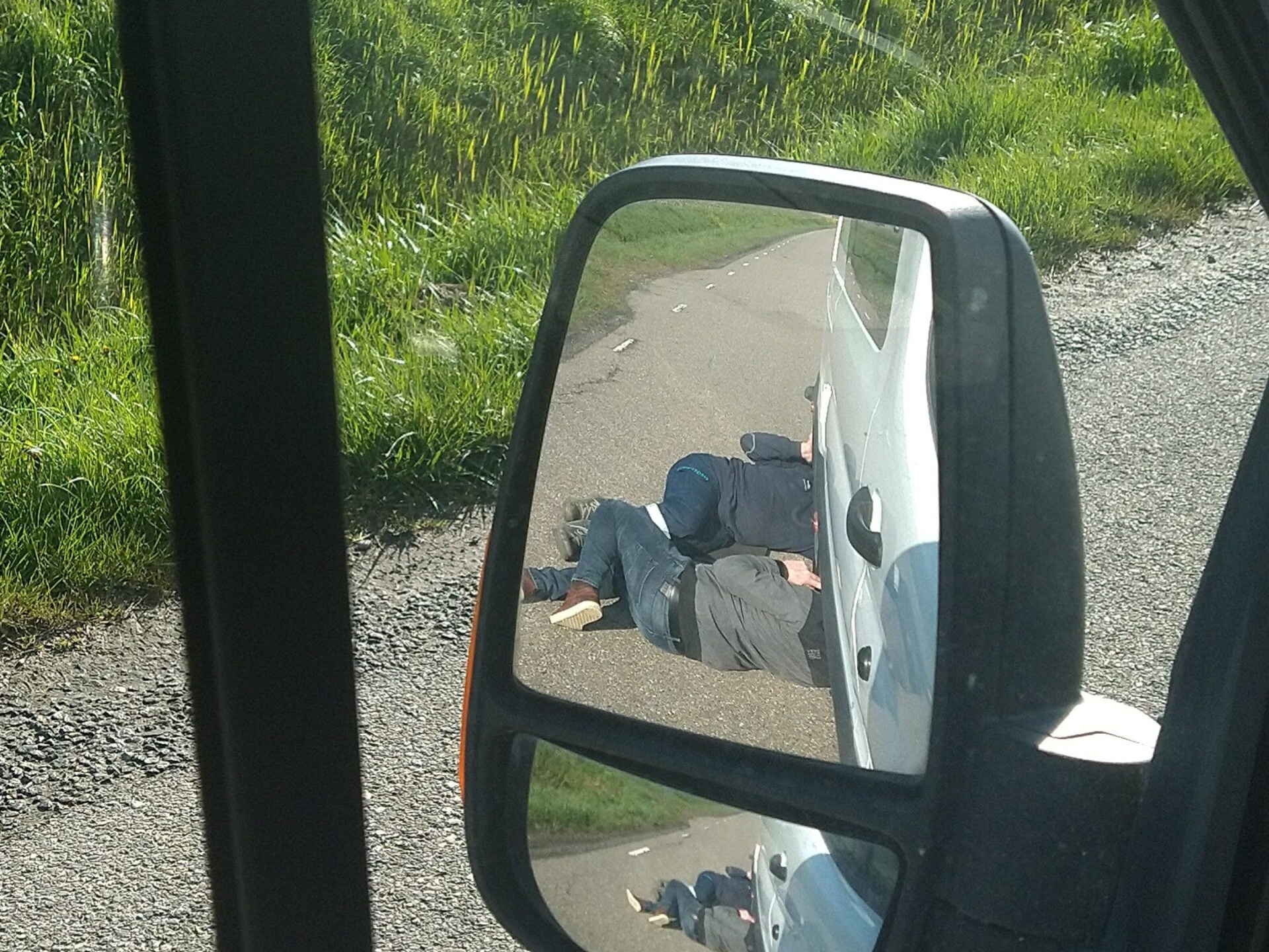 Super gezellig met z'n drietjes voorin!! Echter eindigde onze reis al binnen tien minuten... Na een hoop kabaal hobbelden we opeens in plaats van gewoon te rijden. Hmm... dat is niet oke. Ronald voerde de alarmlichten en gelukkig was het rustig op de provinciale weg. Zo konden we nog rustig doorrollen, de berm oversteken en op de parallelweg tot stilstand komen. We zagen al gauw dat binnen alles keurig in orde was. Ronald ging onder de bus kijken en ook de watertanks hingen nog keurig op z'n plek. Hij zag niet direct het euvel, wel dat de achterkant van de bus heel laag hing. We besloten de ANWB te bellen en binnen een kwartiertje was de monteur al aanwezig! Ronald en de monteur doken samen onder de bus en kwamen tot de conclusie dat de bladveren waren gebroken. Oeps... Te zwaar beladen? Officieel niet, zitten nog ruim onder de toegestane 3500 kg. Versleten? Dat zou kunnen... De conclusie was in ieder geval dat we afgesleept moesten worden. We besloten dat het niet handig zou zijn om met Sophie in een bergingswagen te moeten rijden, dus schakelden we Ronald z'n moeder in. Zij kwam Sophie en mij meteen ophalen en zo waren wij weer vlot thuis. Ronald wachtte bij de bus en bracht deze samen met de berger naar de garage. Ondanks dat het zaterdag was, was de eigenaar van de garage gewoon aanwezig en kon de bus gelukkig meteen veilig geplaatst worden. Want rijden? Dat zit er eventjes niet in. Hopelijk kan de bus snel gemaakt worden met setjes dubbele bladveren geschikt voor zware lading. Want op 24 april staat de keuring gepland en we moeten het bed nog afmaken en de tafel monteren.