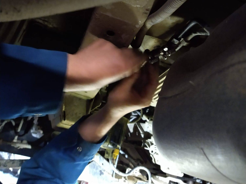 Ronald zorgde samen met collega (Mitchell) ervoor dat de standkachel aangesloten werd op de dieseltank onder de bus. Iets meer monteurskennis was bij dit klusje wel welkom, en daarvoor was Ronald bij Mitchell aan het goede adres. Aan een werkende standkachel zie je niks op de foto, maar er werden tussendoor toch wat foto's gemaakt.