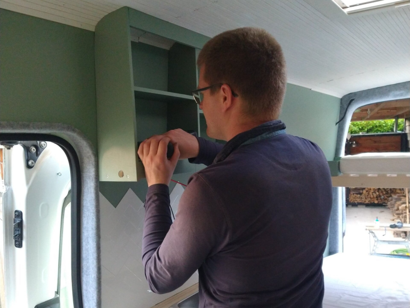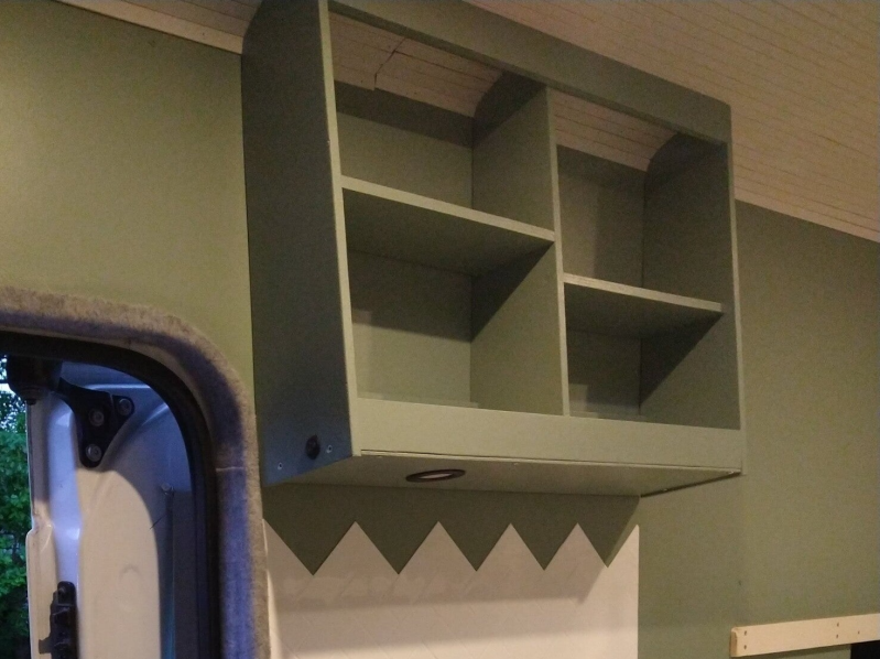 Boven het aanrechtblokje zou ook nog een bovenkastje komen met een spotje ingebouwd. Eerst wilden we deze klus uitstellen tot na het testweekend. Maar met enkele vrije momentjes over besloten we deze toch te zagen. Ronald zorgde ervoor dat de basisplankjes op maat waren en ik maakte het op maat naar de ronding van zowel wand als plafond. Daarna zette ik het geheel in elkaar en verfde het geheel. Welke kleur denk je? Nou precies... groen natuurlijk ;) De deurtjes hebben we nog niet kunnen maken, maar dat komt een andere keer. Tijdens het rijden alleen nog even geen spulletjes in dit kastje zetten natuurlijk haha.