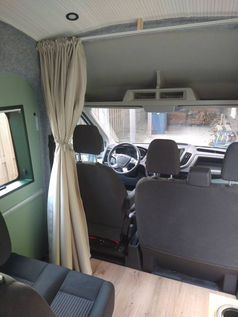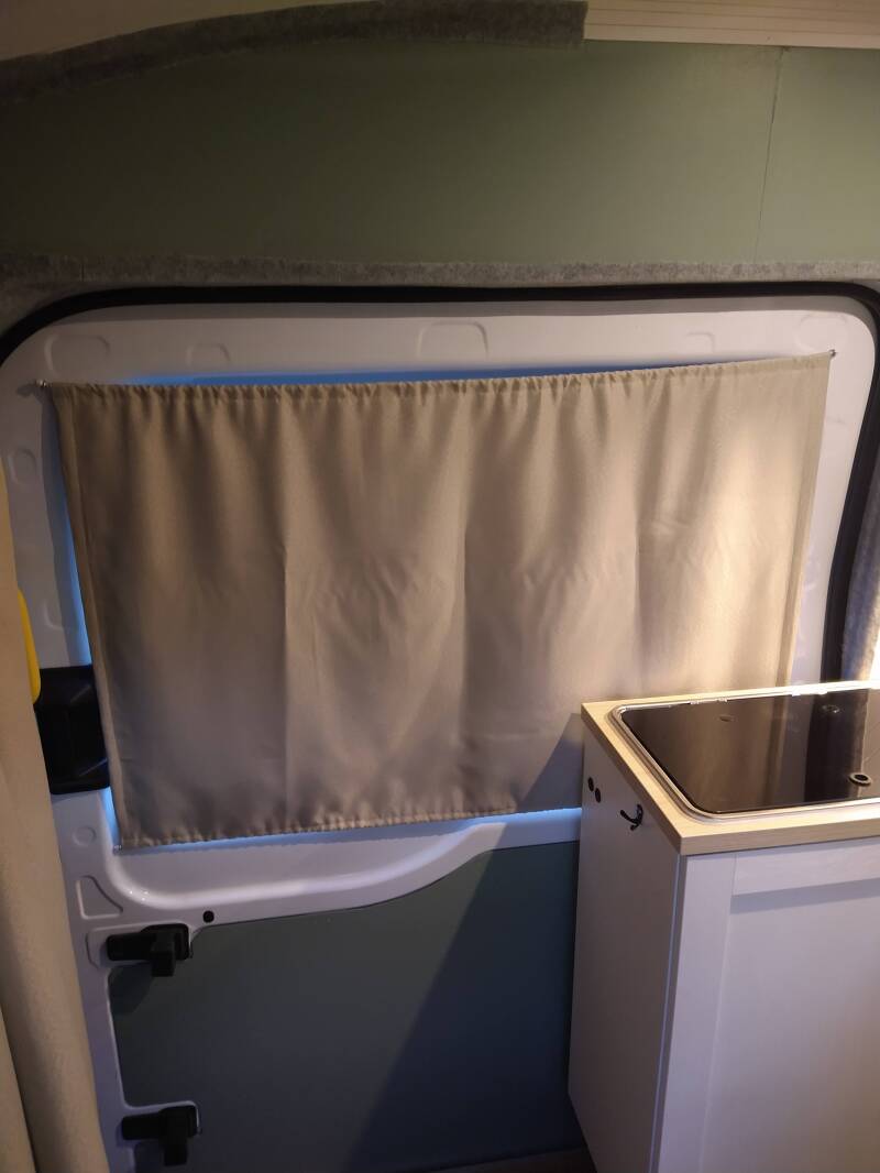 De gordijnen naaide ik samen met mijn moeder. Heel gezellig, maar ook vlot maakten we alle gordijnen op maat. Direct achter de voorstoelen kwamen grote gordijnen die een gezellig huisje maken van de camper voor in de avond. Beide zijramen kregen een klein gordijn, één met een rails in het houten kozijn en één met spandraad direct op het metaal van de zijdeur.