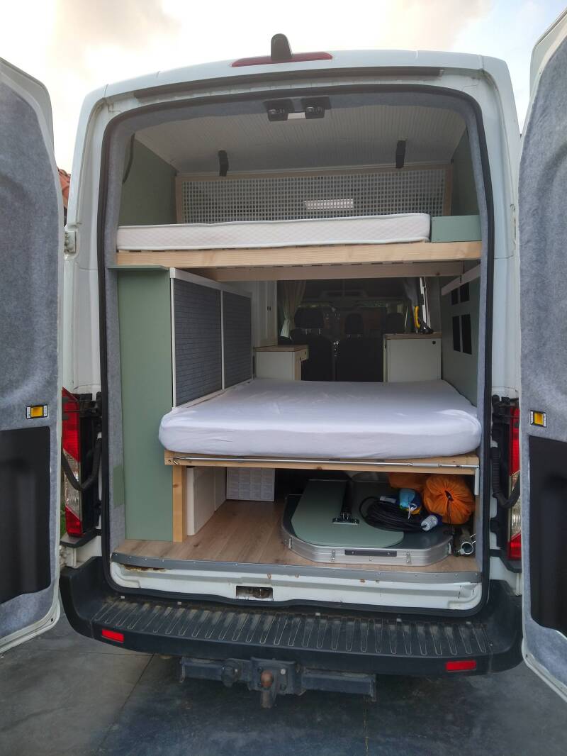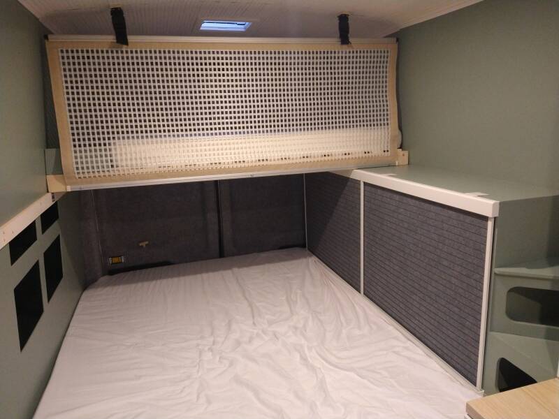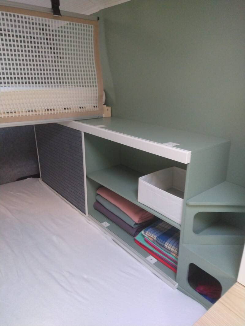 Voor de veiligheid tijdens het slapen van Sophie plaatsen we een net voor het bed. Het is een speciaal voor campers/caravans ontworpen net wat makkelijk te openen is (met gespen aan de bovenkant). Verder maakten we bij het bovenste bed een opbergvak voor Sophie haar boekjes/knuffels. Een standaard peutermatras is 140*70 cm en met het opbergvak erbij van 20 cm breed is dat een mooie oplossing voor de totale breedte. Mocht Sophie te groot worden en die 20cm extra nodig hebben om lekker te kunnen slapen, dan kunnen we dit vak opvullen en kan ze daar haar voeten of hoofdkussen op kwijt. Voorlopig is het nog groot genoeg!