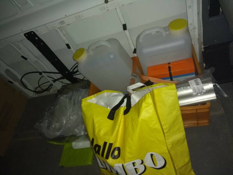 Zaterdag hebben we dus onze boodschappenlijst afgewerkt in de winkel. Daar zijn we zo'n 2 uur mee bezig geweest, maar dan heb je ook zo ongeveer alles wat er maar nodig is om te starten. En dan hebben we het over isolatiemateriaal, huishoudaccu, zonnepaneel, allerhande elektraspulletjes, dakraam, koelkast, wasbakje met jerrycans en inbouwverlichting. Hieronder is meteen het resultaat te zien: