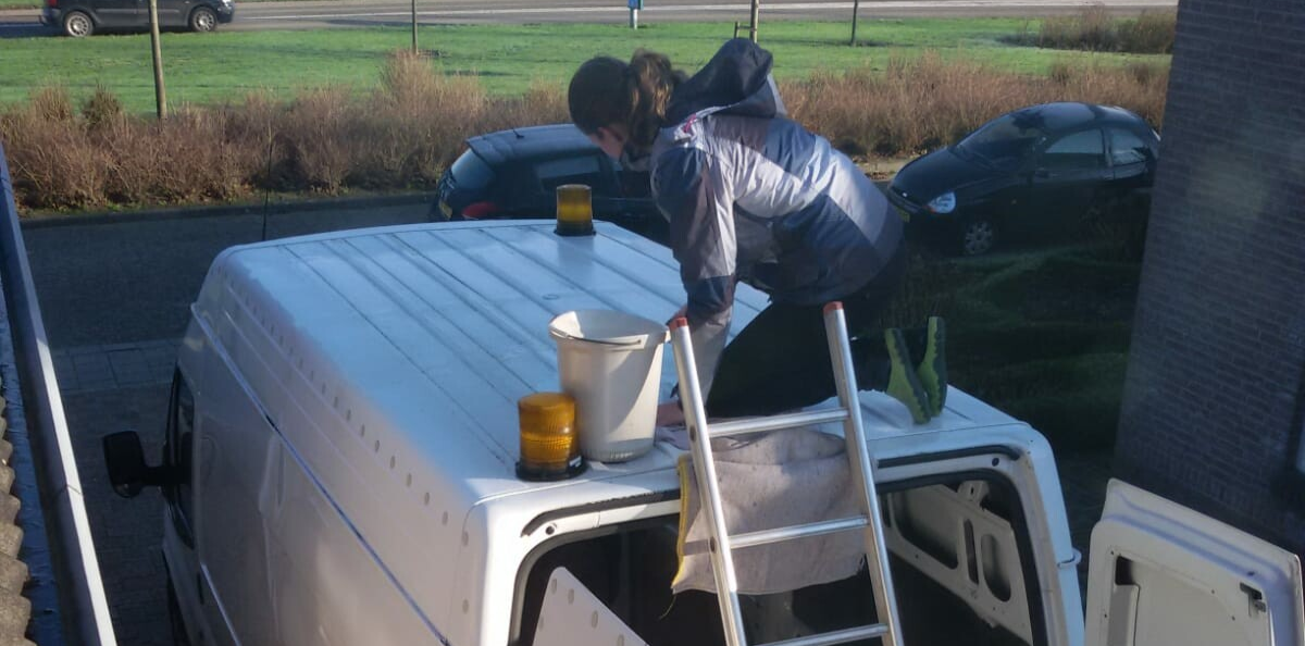 Eerst heb ik het dak schoongemaakt. Dat betekende ook dat ik het dak op moest. Met de ladder tegen de achterkant en dan vervolgens op het dak klimmen ging gemakkelijk. Het dak was stevig genoeg, dus dat was erg prettig. Ronald durfde het namelijk niet aan om het dak op te gaan, dus werd ik de dakwerker. Alleen even uitkijken dat ik niet te ver naar de zijkant ging zitten uiteraard