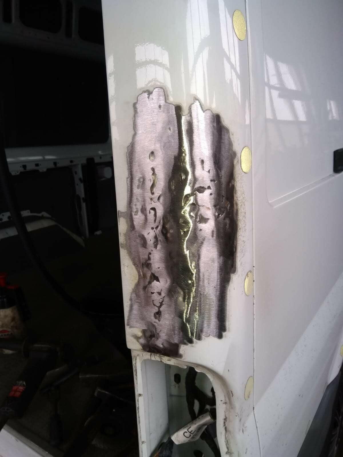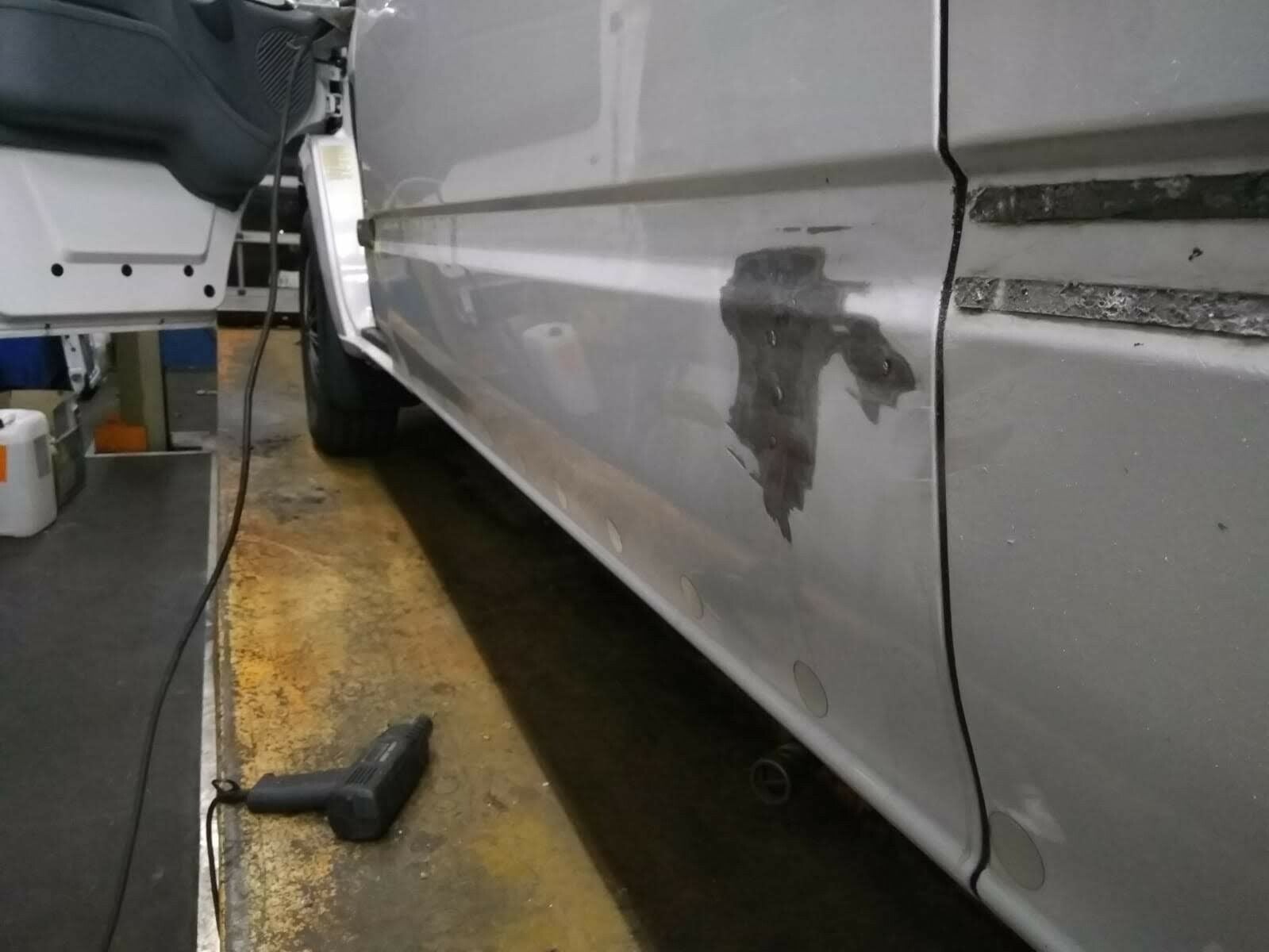 Zoals eerder gezegd, de bus had wat lelijke deuken gekregen van de rijkunsten van de vorige bestuurder. Hierbij de update vanuit de garage met "voor" en "na" foto's van uitdeuken. Of eigenlijk "voor" en "tijdens"! De "na" foto's die komen volgende week.
