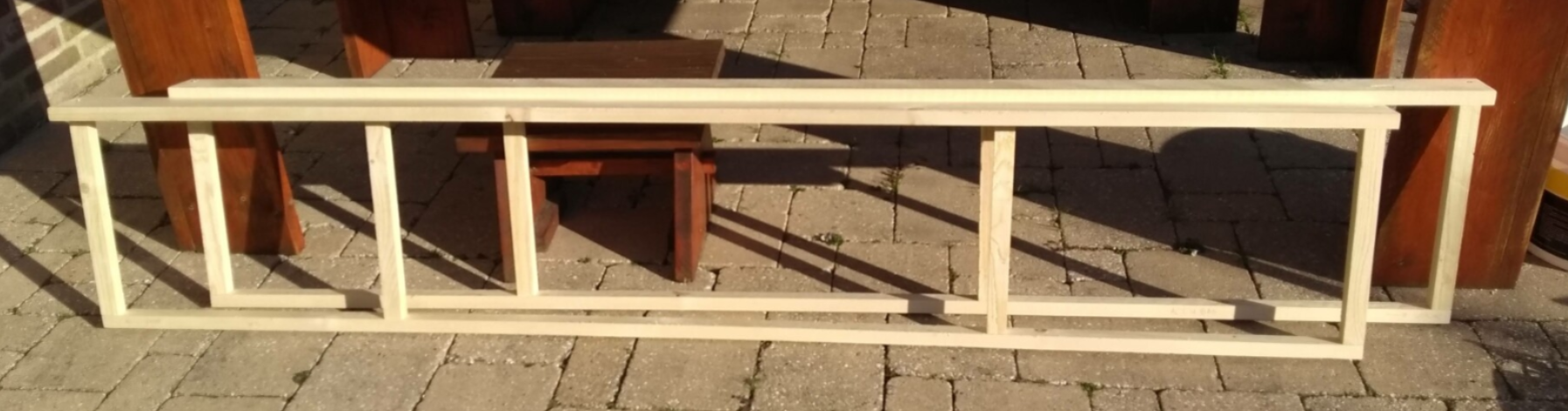 Vanmiddag hebben we een beginnetje gemaakt met het frame van de banken/bed constructie. Gedeeltelijk heb je hiervoor ook de bus niet nodig, want de bouwtekeningen heb ik op de computer. Het was heerlijk weer, dus konden we lekker in het zonnetje in de tuin aan de slag.