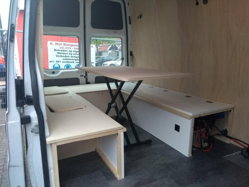 Ons eerste weekendje weg met de bus is in aantocht. En dan moeten we minimaal lekker kunnen slapen in de bus. Dus hebben we de banken afgemaakt. De twee lange banken zijn vaste banken. Het verbindingsdeel wat van de twee lange banken een U-bank maakt, is makkelijk eruit te halen. Zo kunnen we de bus dus ook altijd gebruiken om lange dingen te vervoeren. Het kan maar eens handig zijn. En de tafel laten zakken zorgt ervoor dat we één groot bed hebben.