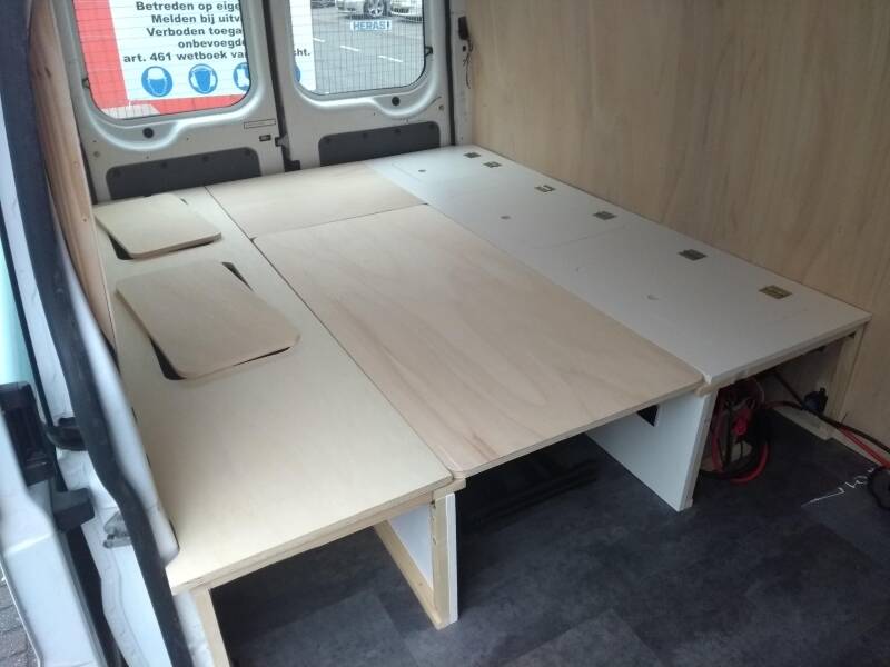 De kleppen in de bank moeten nog vastgemaakt worden, maar eerst nog verven. Als het deze week nog lekker weer is alle onderdelen in de tuin en verven maar. Dan de scharnieren aan de kleppen maken en de onderdelen vastmaken. De maten van de matrassen zijn doorgegeven, dus wie weet kunnen we al op de echte matrassen slapen! En anders leggen we twee gewone matrassen in de bus. Het bed is namelijk heerlijk ruim met afmetingen van 180*200 cm.