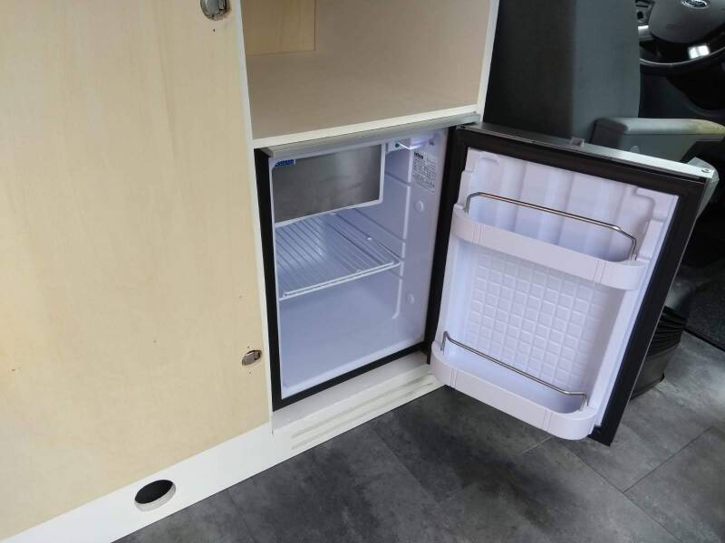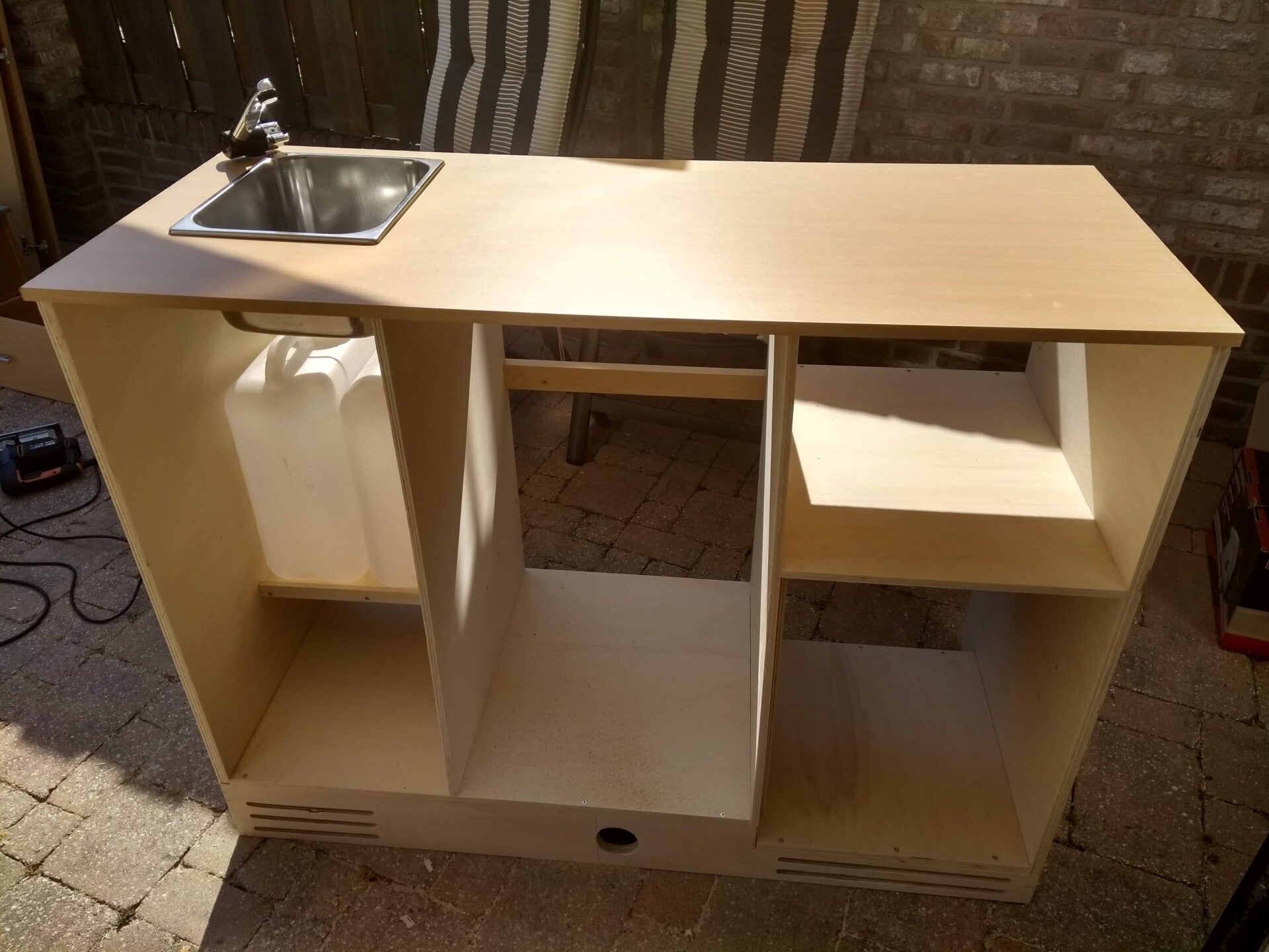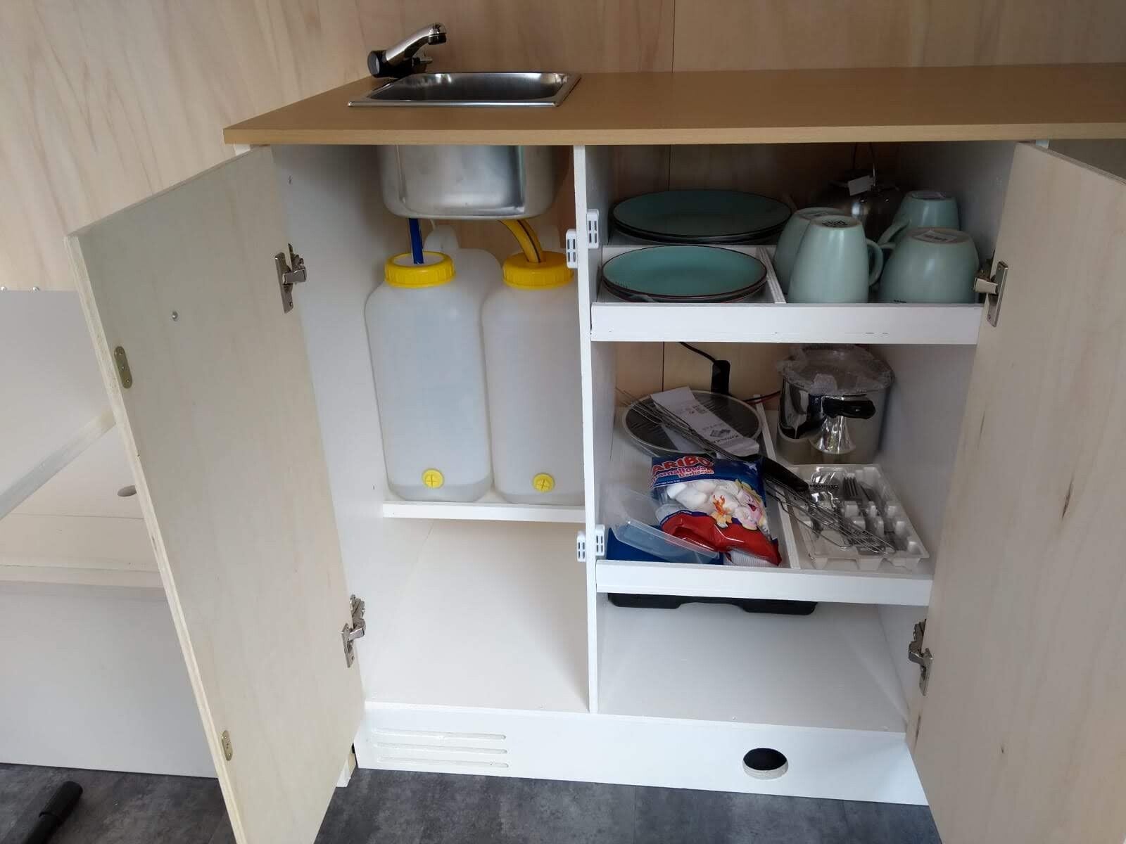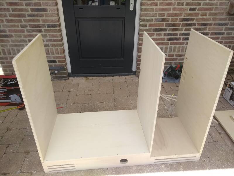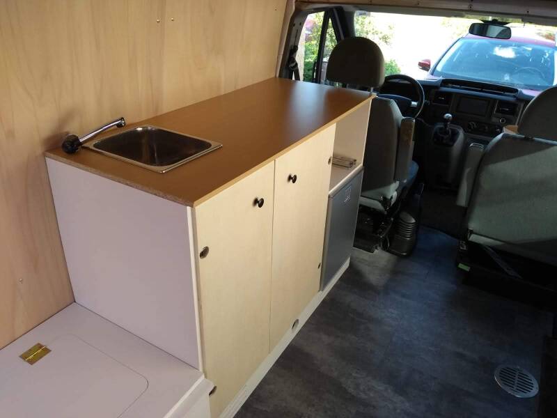 Aan de keuken moesten we nog beginnen. De onderdelen waren allemaal aanwezig, maar alles moest nog op maat gemaakt worden en in elkaar gezet. Het liefst ook nog een likje verf om het hout te beschermen. De koelkast die we hadden staan is een inbouwvariant met klein vriesvakje (voor de ijsjes op vakantie!!). Voor het water hebben we een 16 liter schoon- en vuilwaterjerrycan, een wasbakje, een dompelpompje en kraan. Koken doen we op een eenvoudig 1 pits gaskookplaatje of natuurlijk lekker barbequen! De deurtjes van de keuken mogen natuurlijk niet open gaan tijdens het rijden, dus die zijn voorzien van magneetsluitingen. De plankjes in het kastje zijn ingedeeld met opstaande randjes, zodat het servies en ook de etenswaren niet door de hele kast heen en weer schuiven. De randjes in combinatie met antislipmatjes, zorgen ervoor dat er geen herrie uit de keuken komt tijdens het rijden. Nu een aantal foto's van keuken in aanbouw, tot keuken (bijna) klaar: