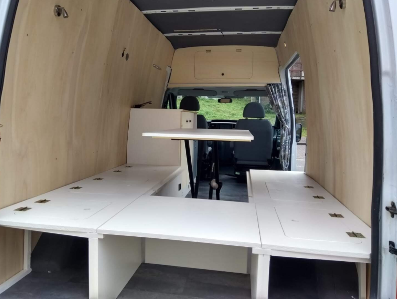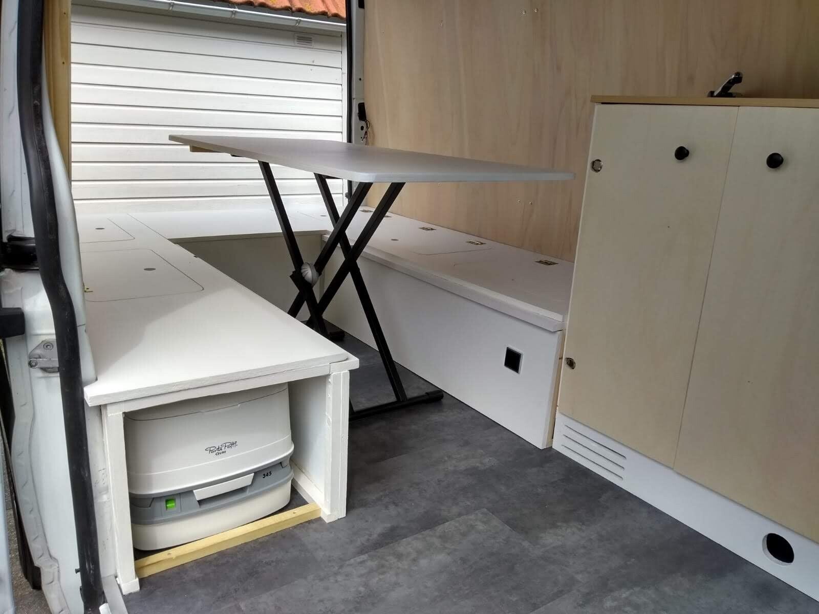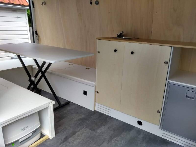 De banken, tafel, bed combinatie was al zo goed als af. Hier hebben we nog kleine verbeteringen aangebracht. Zo kan de tafelpoot tijdens het rijden in een klem worden geplaatst, zodat die niet door de bus gaat. En het tafelblad heeft een latje aan de onderkant, die precies in uitsparingen kan vallen, zodat ook het tafelblad netjes op zijn plaats blijft liggen tijdens het rijden. Verder heeft onze "pottie" z'n plekje gekregen, en ook hier een latje bevestigd tegen het verschuiven tijdens het rijden. Deze is voor onderweg of 's nachts of nouja, wanneer je 'm nodig hebt. Voor het vervoeren van lange dingen (kan maar eens handig zijn?) kan een deel van de bank eruit gehaald worden.