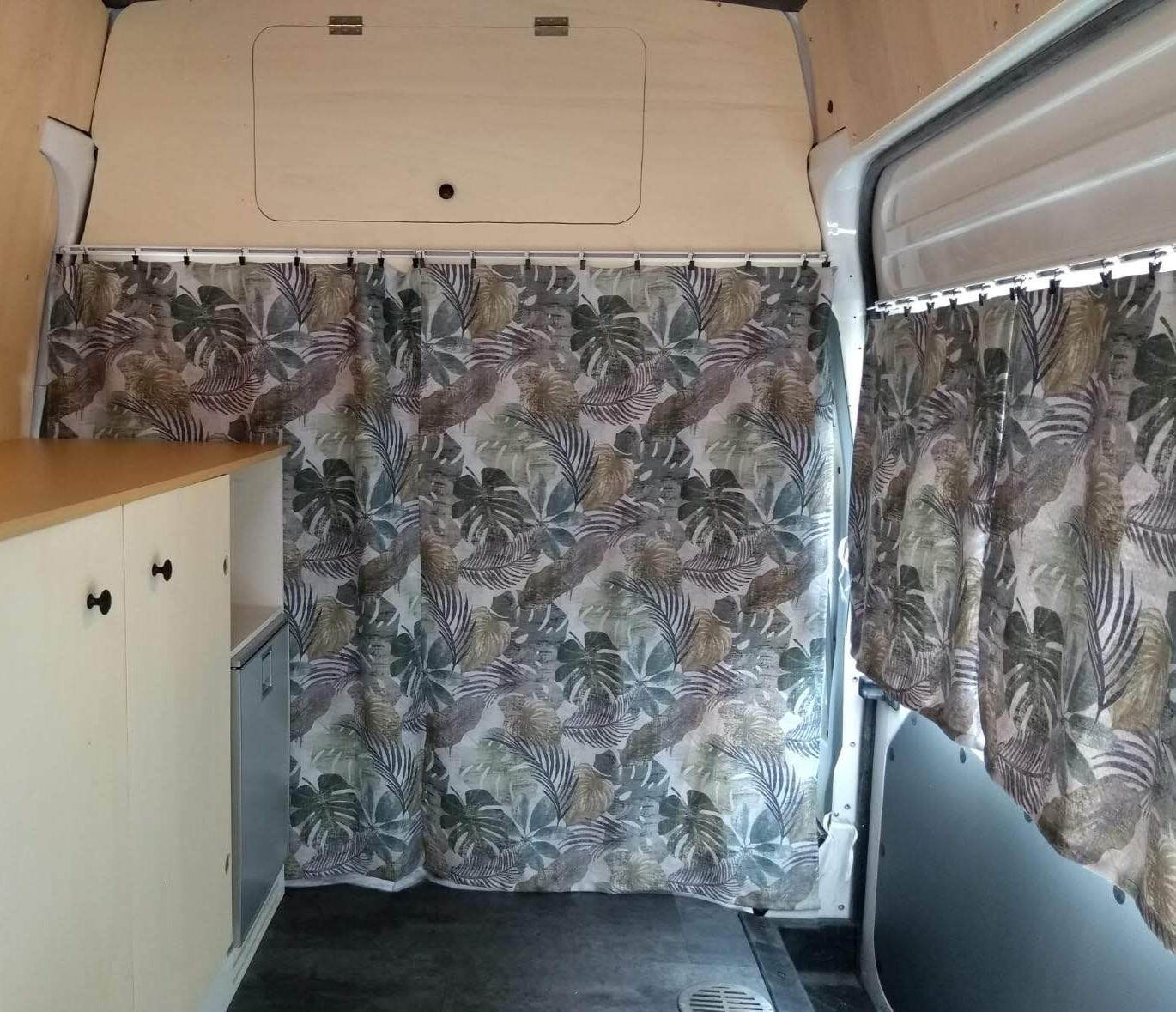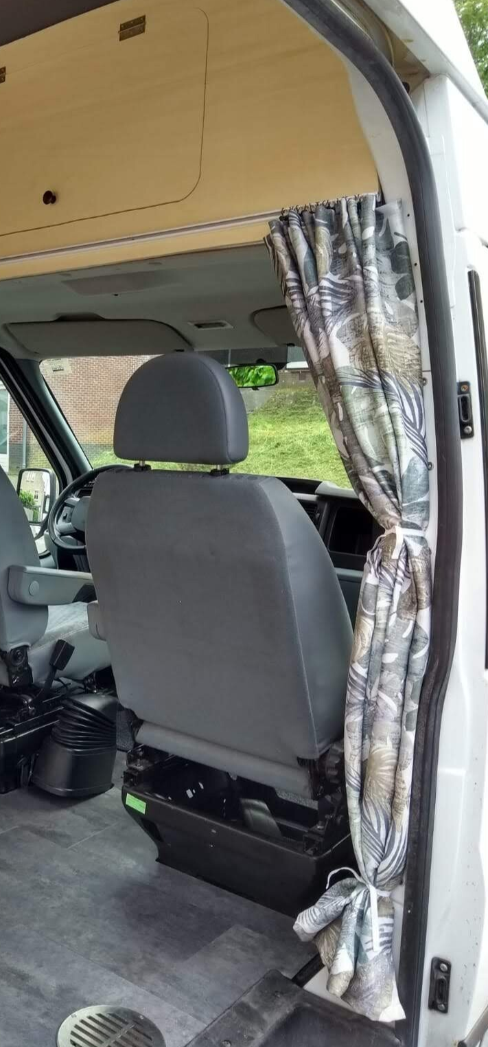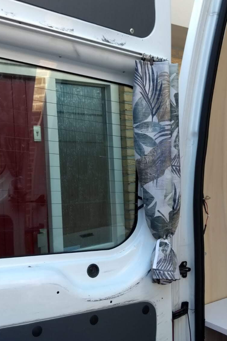 Voor de ramen hadden we verduisterende gordijnstof gekocht. Oma heeft hiervan mooie gordijntjes genaaid. Dus rails aan de camper monteren, runners eraan, gordijntjes ophangen en klaar! Met bandjes kunnen de gordijntjes mooi naar de zijkant geknoopt worden voor tijdens het rijden. De gordijnrails voor de gordijnen achter de voorstoelen moest worden bevestigd aan de bovenklep. Dus besloten we de bovenklep af te maken met scharnieren, knopje en magneetsluitingen. Zodat dit er netjes uit ziet, praktisch is, en de rails meteen op de juiste plek gemonteerd kon worden.